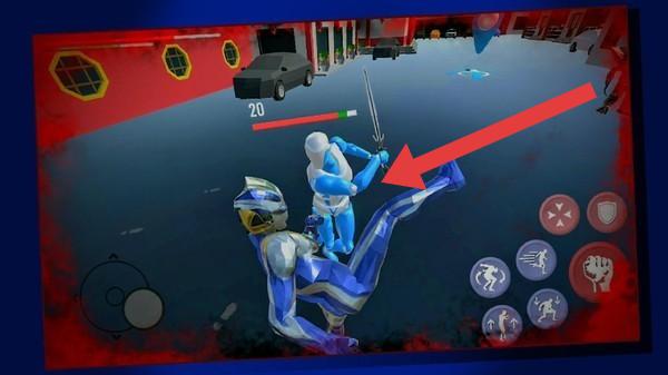 3、呈現兩個奧特曼角色戰(zhàn)斗場景,一個持劍、有“20”數值顯示(是血量等),右側有技能按鍵,屬于奧特曼主題,玩家可操控角色格斗,體驗對戰(zhàn)樂趣。