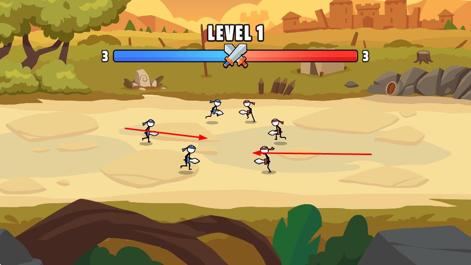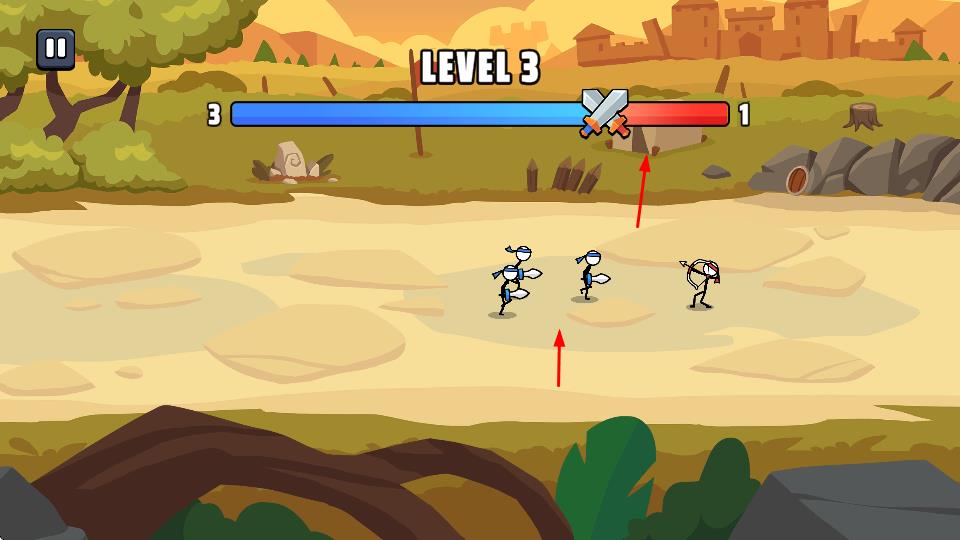 1、在LEVEL1,指揮藍(lán)色火柴人部隊(duì),按箭頭方向進(jìn)攻紅色敵方,利用數(shù)量優(yōu)勢推進(jìn)戰(zhàn)斗。