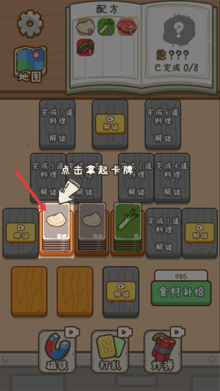 2、拿取卡牌:點擊箭頭指向的卡牌,獲取食材卡片。