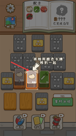 3、合并卡牌:拖動同色卡牌(如淺色食材卡)移到一起,完成合成。
