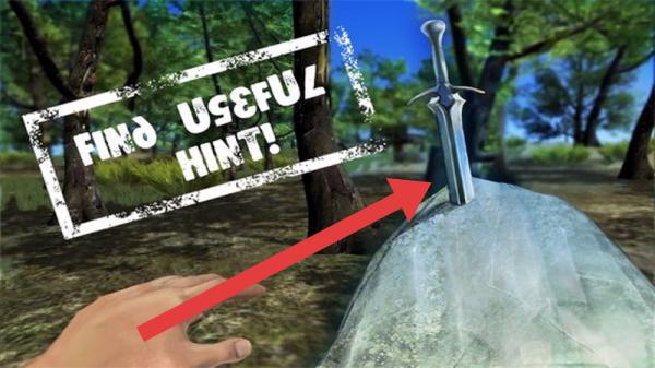 1、呈現(xiàn)“FINDUSEFULHINT!”(尋找有用線索)的提示,以及石中劍等元素,屬于探索解謎玩法場景。