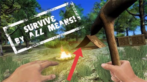 2、文字“SURVIVEBYALLMEANS!”體現(xiàn)生存主題,呈現(xiàn)野外營地(帳篷、篝火等)、工具(木鎬)等元素,屬于求生玩法場景。