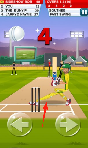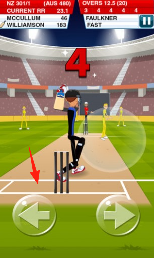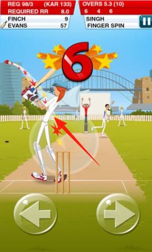 1、擊球機(jī)制控制火柴人擊球手,在球場(草地、專業(yè)體育場),根據(jù)投球(如FingerSpin、FastSwing),點(diǎn)擊左右箭頭,完成“6分擊球”“4分擊球”等得分動(dòng)作。