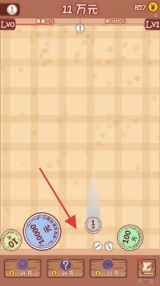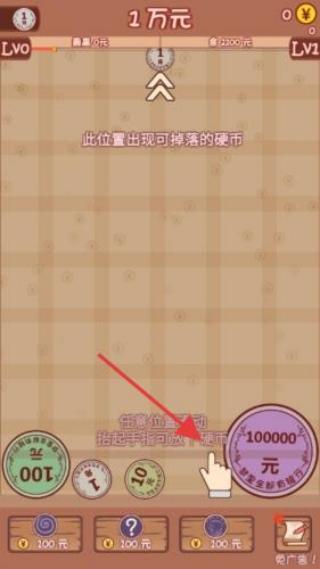 1、放置硬幣:拖動大額硬幣(如100000元)到指定區(qū)域,觸發(fā)金幣掉落。