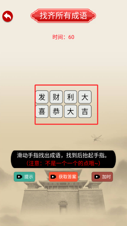 3、在規(guī)定時間內(nèi)找到兩個成語,即可完成本關(guān)。