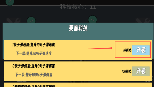 3、點(diǎn)擊紅箭頭子彈速度區(qū)域,消耗10核心升級(jí)。