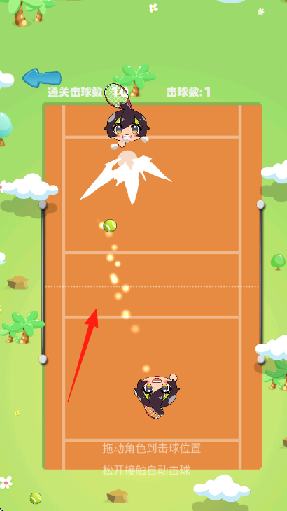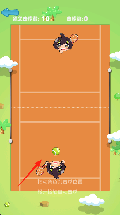 2、操作機(jī)制在網(wǎng)球場(chǎng)地,拖動(dòng)角色(卡通人物)到擊球位置,松開自動(dòng)擊球,需完成“通關(guān)擊球數(shù):10”目標(biāo),積累“擊球數(shù)”。