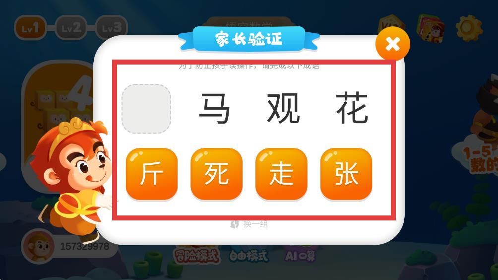 2、彈出家長驗證窗口,完成成語填空,通過驗證進入設(shè)置頁。