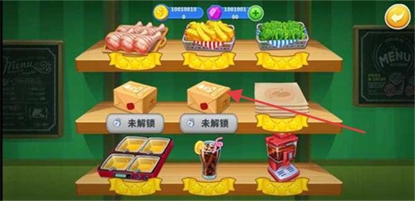 2、食材界面,解鎖“未解鎖”食材(如盒裝物品),消耗資源(金幣、鉆石),擴充菜單,滿足顧客訂單需求。
