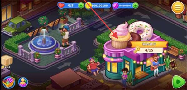 1、城鎮(zhèn)界面,點“甜品店”(帶大蛋糕建筑),推進店鋪建設(4/15),吸引顧客,賺金幣、鉆石,升級城鎮(zhèn)。