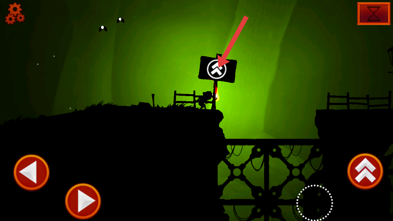 3、游戲中通過左下角方向鍵(左轉、前進)與右側按鍵,操控剪影角色,跟隨場景路標指引,探索并推進關卡。