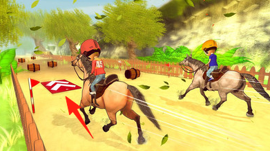 2、賽馬競速騎小馬,在賽道避木桶、繞旗標,比拼速度,支持多人競賽(紅、藍帽角色),積累比賽積分。