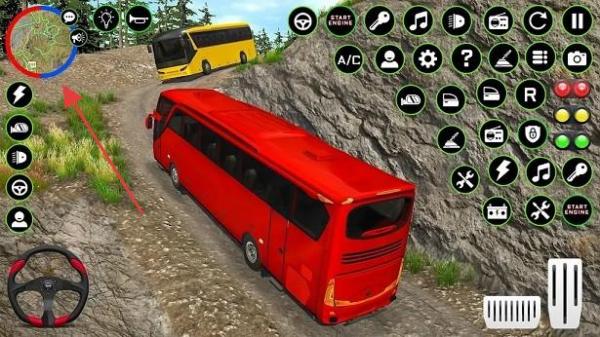 2、切換紅色巴士挑戰(zhàn)山地土路,借小地圖規(guī)劃路線,控速避障,應(yīng)對崎嶇地形考驗。
