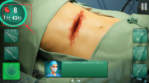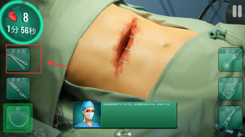 2、在手術(shù)模擬環(huán)節(jié)選取相應(yīng)醫(yī)療器械,按照提示步驟完成傷口清理與縫合操作。