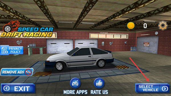 1、在車庫(kù)點(diǎn)【SELECT VEHICLE】,選初始賽車,了解車輛漂移、加速性能,為比賽做準(zhǔn)備。