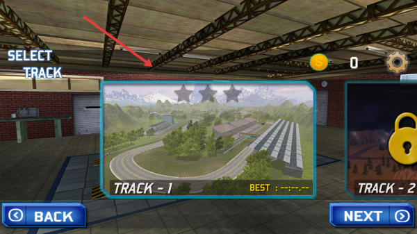 2、進(jìn)入賽道選擇,選“TRACK-1”,熟悉該賽道彎道、地形,規(guī)劃漂移路線,爭(zhēng)取好成績(jī)。