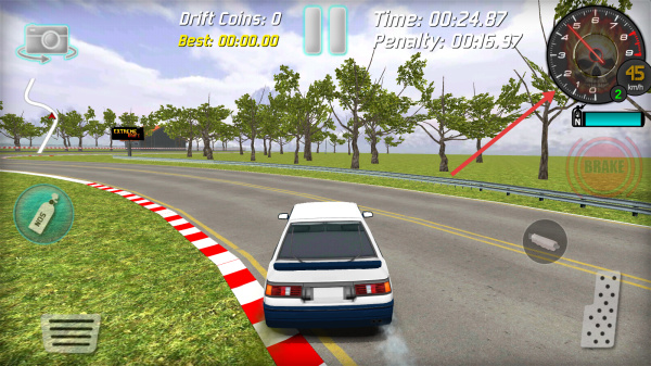3、駕駛賽車在賽道行駛,借彎道漂移攢分,關(guān)注儀表盤速度與時(shí)間,避罰時(shí),沖線完成比賽。