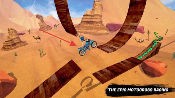 2、參與“EPIC MOTOCROSS RACING”,沿沙漠賽道行駛,過(guò)環(huán)形坡道等障礙,比拼競(jìng)速與特技。