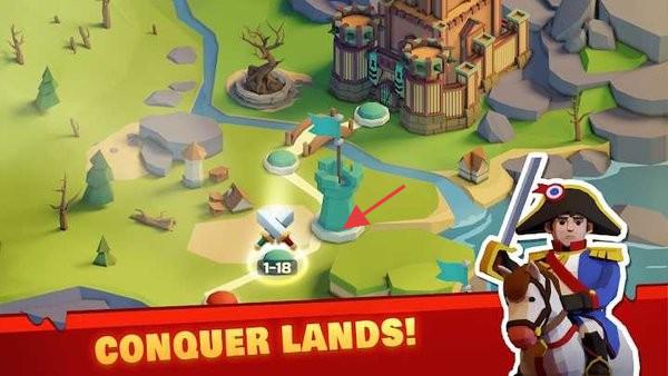 1、在大地圖選關(guān)卡(如1-18),點(diǎn)擊建筑推進(jìn),執(zhí)行“CONQUERLANDS!”,占領(lǐng)領(lǐng)土。