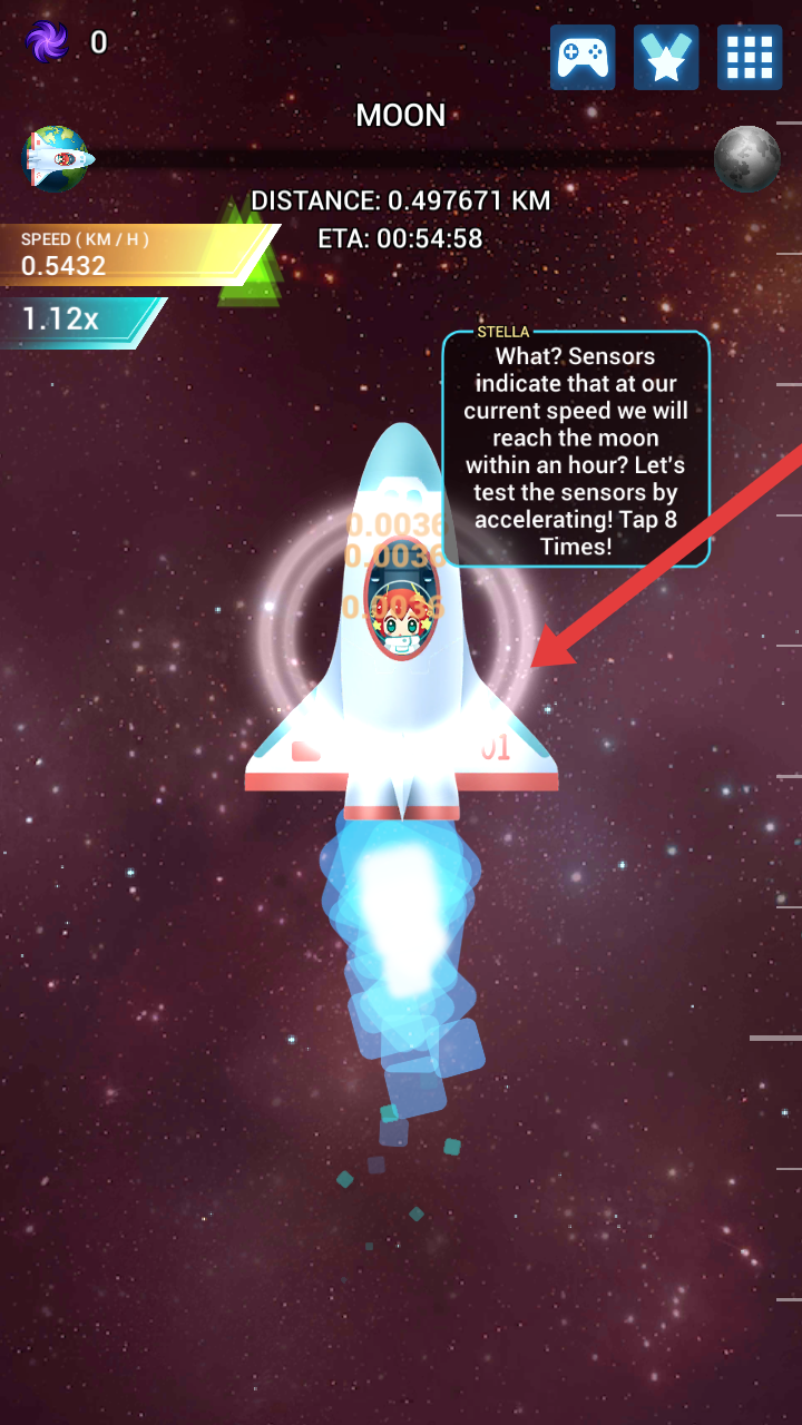 3、根據(jù)提示【Tap8Times】點(diǎn)擊火箭8次,加速航行測(cè)試傳感器,縮短抵達(dá)月球的時(shí)間。
