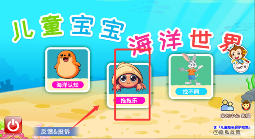 1、進(jìn)入游戲后先選擇喜歡的海洋場景,通過點擊或拖動方式與不同生物互動。