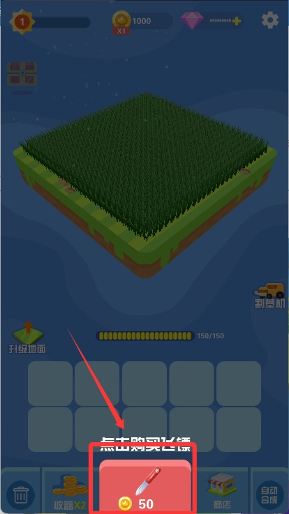 4、完成目標(biāo)后進(jìn)入商店,用金幣升級武器威力、割草機(jī)速度及稻草單價(jià),還可運(yùn)用鉆石購買稀有皮膚,讓下一輪割草更有效率。