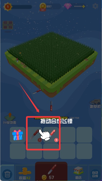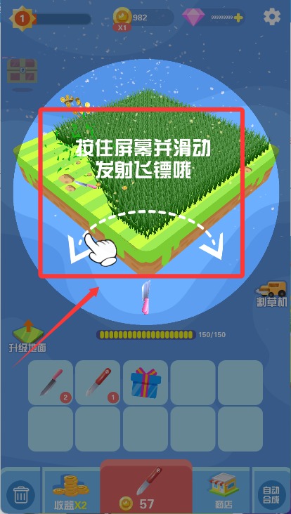 3、按住屏幕并滑動就可以發(fā)射飛鏢割草了。