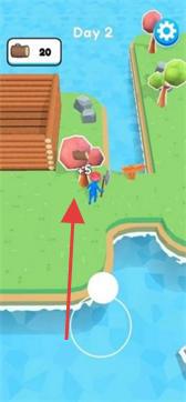 2、離開(kāi)木屋,按指引(紅色箭頭)探索島嶼,收集材料(如樹(shù)木、石塊),擴(kuò)充資源儲(chǔ)備。