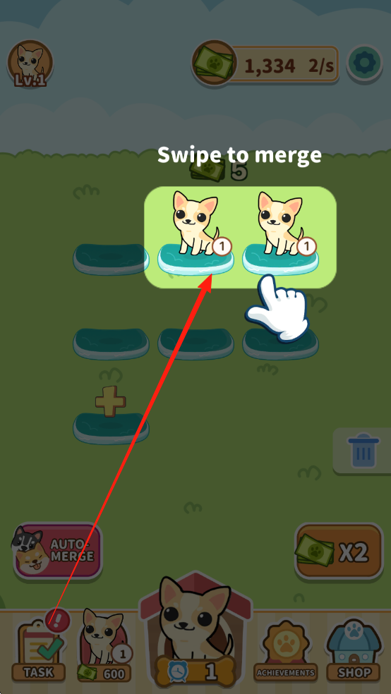 1、觀察合成界面與小狗分布,優(yōu)先規(guī)劃合成路線,通過精準(zhǔn)控制點(diǎn)擊位置與順序,巧妙合成相同小狗,確保高效解鎖高級(jí)品種。