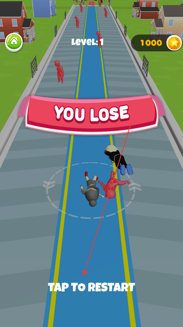 1、點擊“TAPTOPLAY”開始Level1,操控角色在道路跑酷,利用保鏢(黑衣、墨鏡男)抵御紅色敵人。