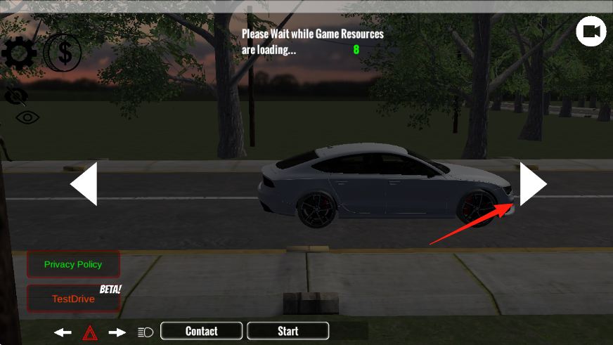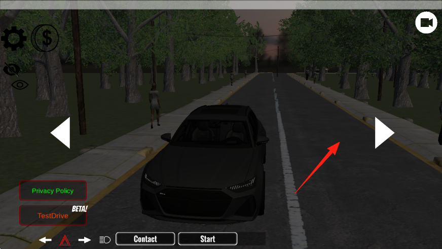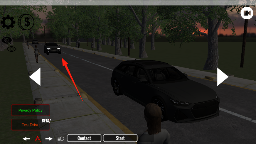 3、有設(shè)置(齒輪)、貨幣($)圖標(biāo),“PrivacyPolicy”(隱私政策)、“TestDrive”(試駕)按鈕,支持聯(lián)系(Contact)、開始(Start)游戲,模擬真實(shí)駕駛體驗(yàn)。