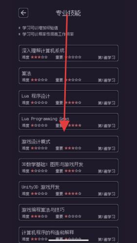 2、技能提升:在“專(zhuān)業(yè)技能”界面,優(yōu)先學(xué)習(xí)高權(quán)重(如Lua程序設(shè)計(jì))、高需求技能,提升工作效率,解鎖高薪職業(yè)。