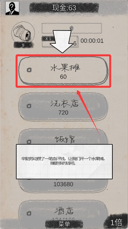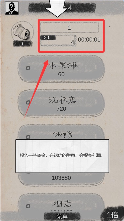 2、將資金投入水果攤或洗衣店后,在收益達(dá)到預(yù)定值時升級店鋪規(guī)模,提升產(chǎn)出效率并解鎖下一行業(yè)選項(xiàng)。