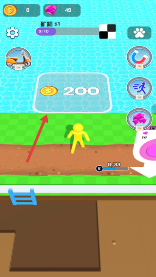 2、含礦區(qū)地表、礦洞,顯示金幣、鉆石數(shù),需拓展挖掘區(qū)域,解鎖新礦洞,積累資源升級(jí)礦工、購買道具(如磁鐵)。