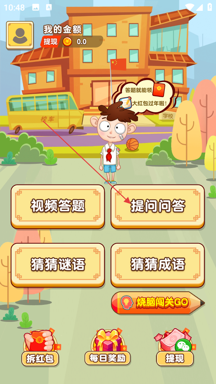 3、完成答題進度(如0/5),可領(lǐng)取紅包、獎勵,積累金額后提現(xiàn),繼續(xù)挑戰(zhàn)新關(guān)卡。