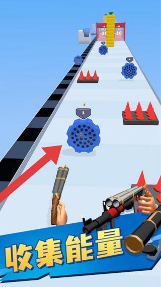 3、畫面中展示了玩家操控的多種武器,跑道上設(shè)有藍色齒輪狀、紅色錐形等陷阱,還存在能量收集標(biāo)識,呈現(xiàn)出玩家需在躲避陷阱的同時收集能量的場景。
