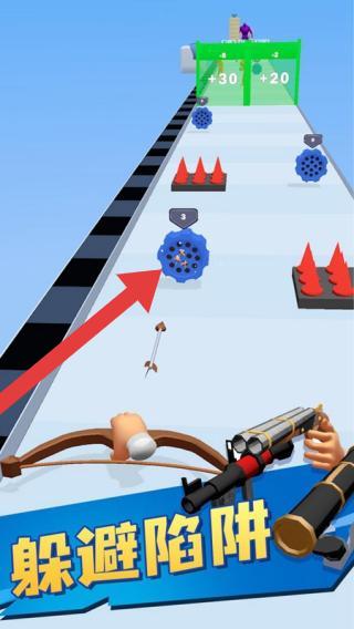 1、畫面中有弓箭、槍械等武器,跑道上有藍色齒輪狀、紅色錐形等陷阱,呈現(xiàn)出玩家需操控角色躲避陷阱、收集道具并使用武器的場景。