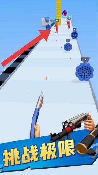 2、畫面中有玩家操控的武器,前方道路上分布著藍色齒輪狀陷阱,還有紅色小人敵人,展現(xiàn)出玩家需在跑酷過程中躲避陷阱、射擊敵人來挑戰(zhàn)極限的玩法。