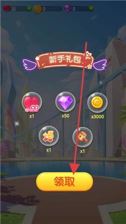 1、點擊“領(lǐng)取”新手禮包(愛心、鉆石、金幣等),積累游戲資源。