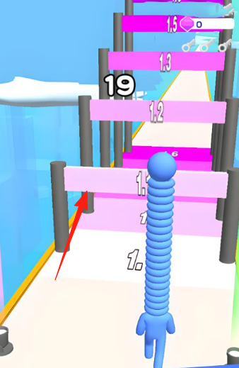3、面對粉色障礙欄,計(jì)算高度,讓角色彈簧頂起時(shí)恰好越過【粉色橫欄】,繼續(xù)沖刺。