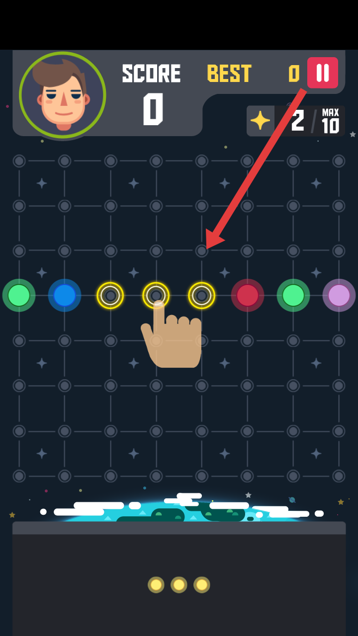 1、在行星拼圖的游戲開局,跟隨指引點擊網格上的黃色圓環(huán),觸發(fā)初始連消操作,開啟得分模式。