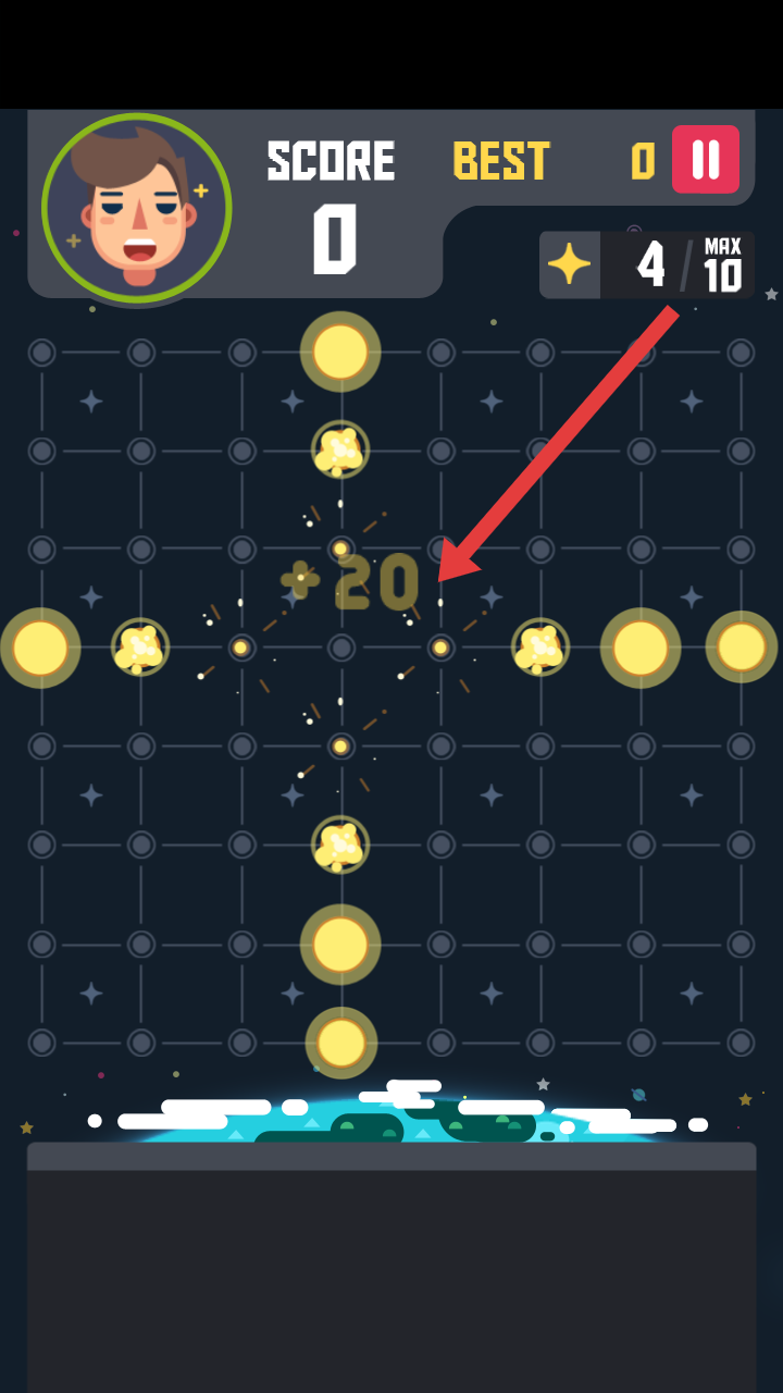 2、在操作中需要形成十字對稱的黃色圓環(huán)組合,觸發(fā)爆炸特效,獲取【+20】積分,提升SCORE數值。
