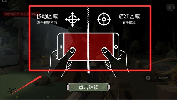 1、首先進(jìn)入游戲后,我們先熟悉一下操作,左邊控制方向,右邊控制瞄準(zhǔn),以及攻擊、換彈鍵。