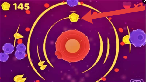 2、游戲中操控紅色核心,沿黃色軌道移動(dòng),收集黃色道具積累金幣(如【145】),規(guī)避紫色敵人,維持【x1】血量續(xù)航。