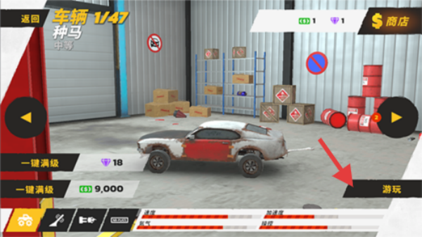 1、車庫選車:在車庫選“種馬”等賽車,消耗資源升級(jí)速度、加速等屬性,點(diǎn)擊“游玩”進(jìn)入戰(zhàn)場(chǎng)。