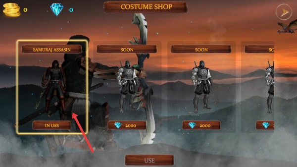 3、在“COSTUME SHOP”,能看到不同武士皮膚(如SAMURAI ASSASSIN),消耗鉆石解鎖新皮膚后點擊“USE”更換。