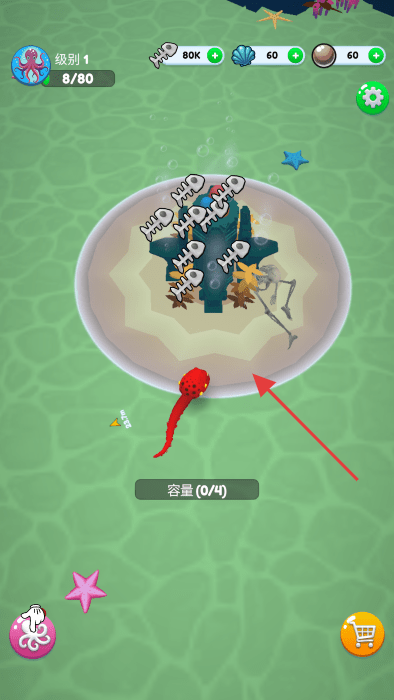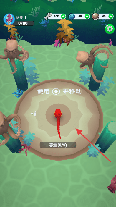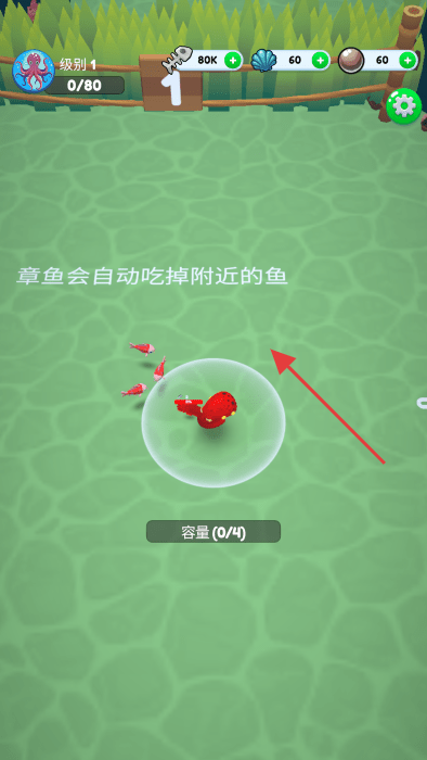 2、利用移動功能讓章魚在場景游動,借助自動吃魚機制積累經(jīng)驗,提升等級進度。
