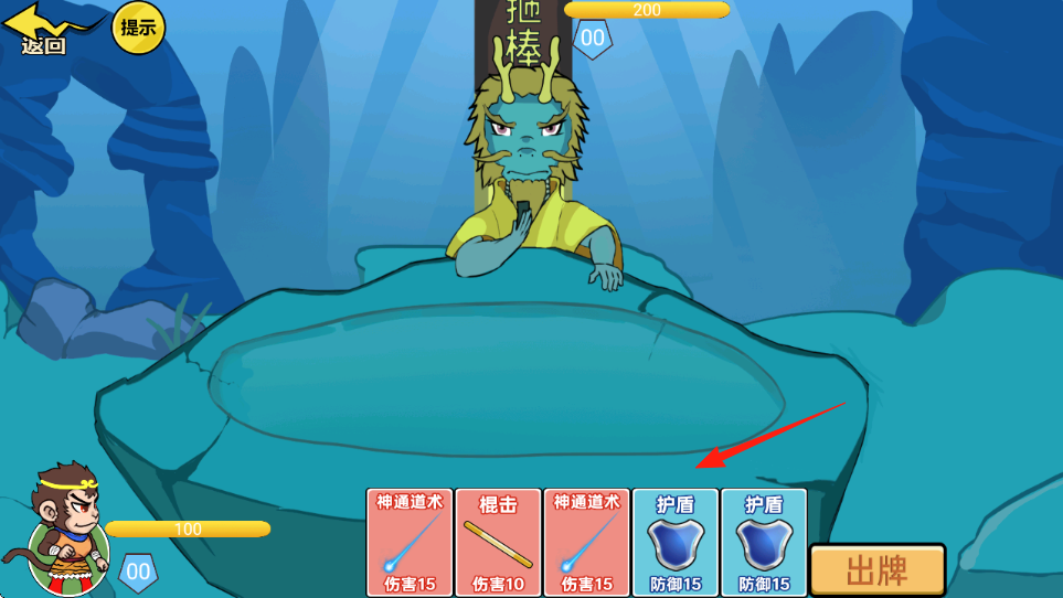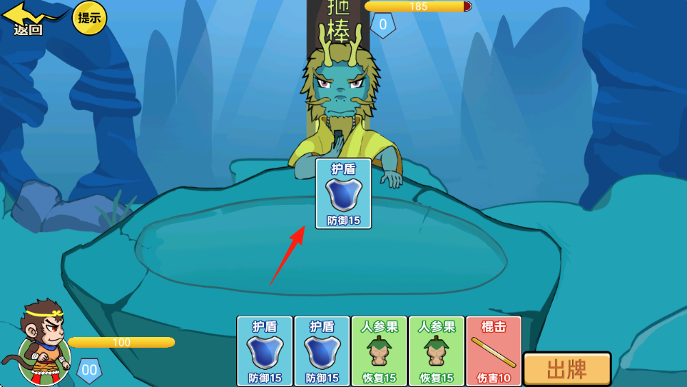2、戰(zhàn)斗時,選擇【箭頭】指向的“護盾”卡牌,點擊出牌,為角色疊加防御,抵御龍王攻擊。