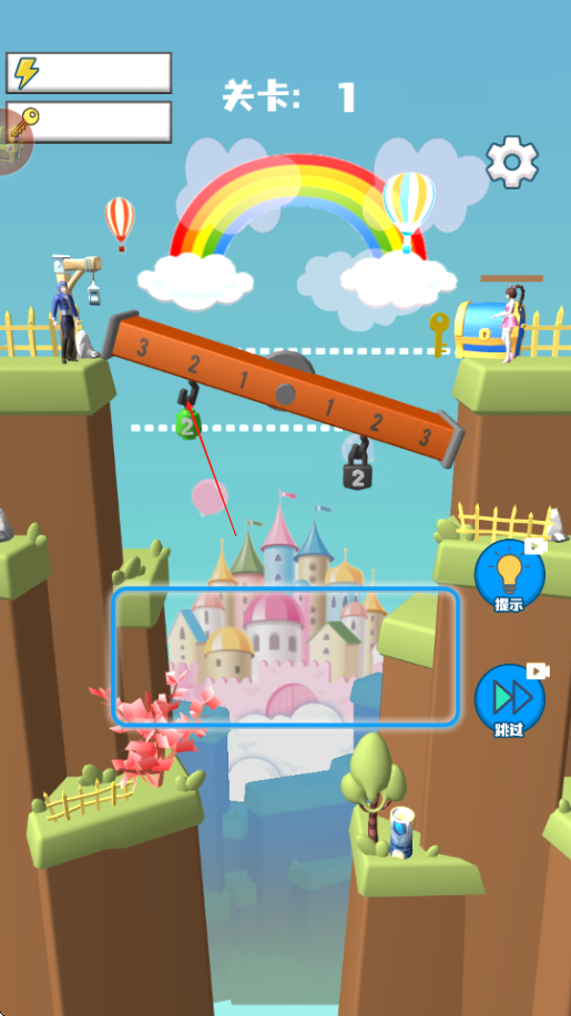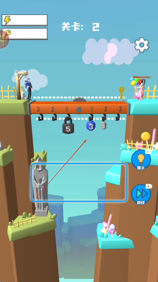 2、通過點(diǎn)擊或拖拽場景中的可交互元素,如調(diào)整木板傾斜角度、在杠桿兩端放置不同重量的石塊、移動彈簧擋板等,利用物理學(xué)中的杠桿原理與重心偏移規(guī)律。