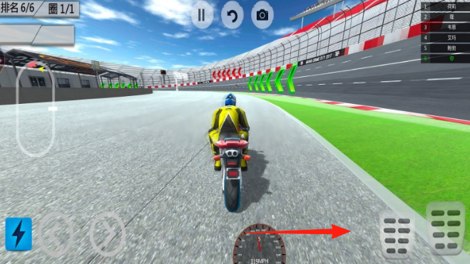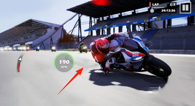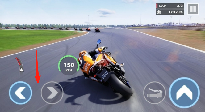 2、遇彎道時(shí),點(diǎn)擊【箭頭】所指方向按鍵,調(diào)整摩托轉(zhuǎn)向,精準(zhǔn)過(guò)彎,維持速度。